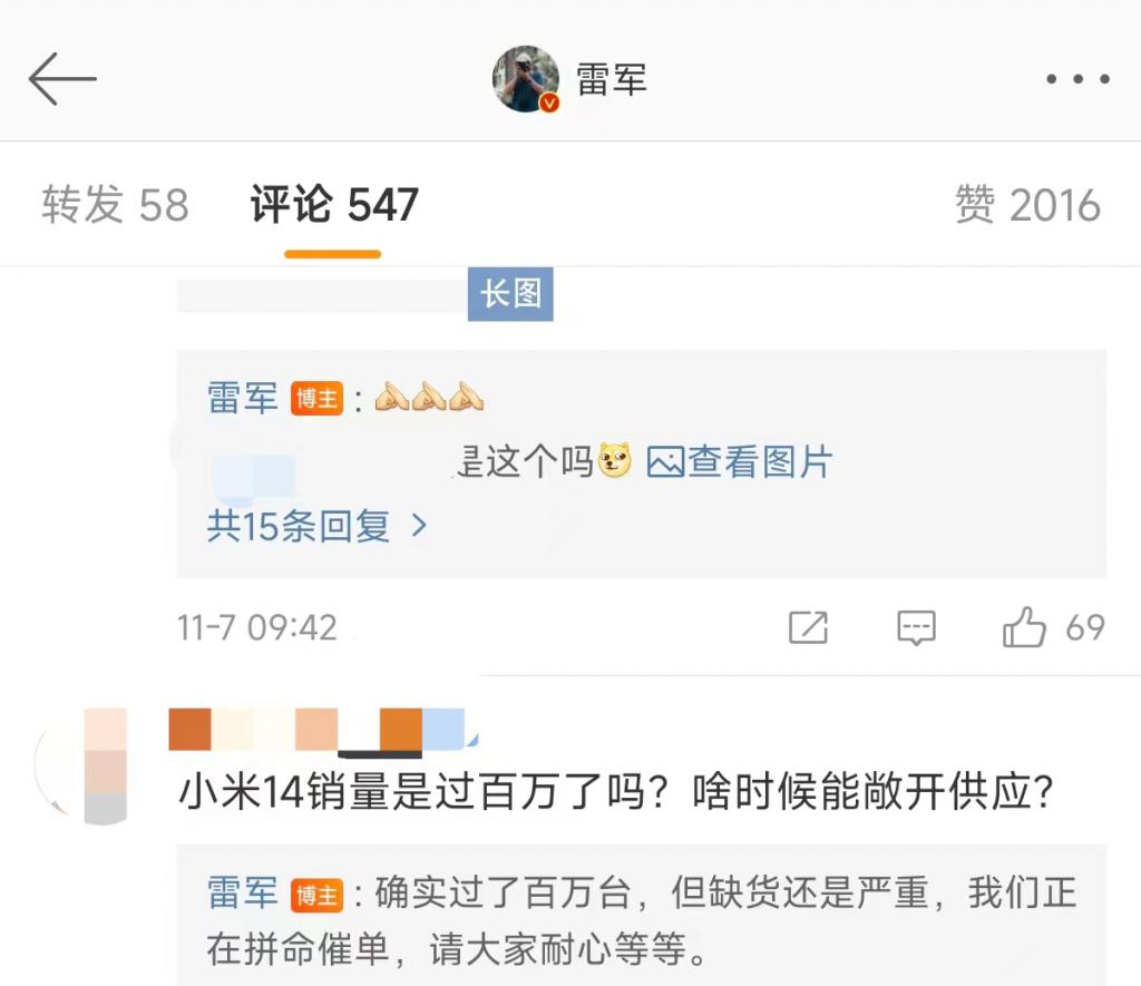《科创板日报》11 月 7 日讯(编辑 宋子乔) 今日上午,小米集团创始人、董事长兼 CEO 雷军在微博与网友互动时称,小米 14 系列销量已超过 100 万台,目前缺货还是严重," 我们正在拼命催单。"