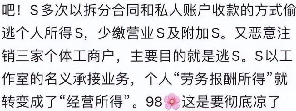 据羊城晚报报道,据爆料,宋祖儿偷税涉及金额达 4500 万,已经被约谈。爆料者称,宋祖儿多次以拆分合同和私人账户收款的方式偷逃个人所得税,还少缴营业税和附加税。其间还注销了三家个体工商户,如此操作的主要目的就是为了逃税。宋祖儿还以工作室的名义承接业务,这样个人 " 劳务报酬所得 " 就转成了 " 经营所得 "。