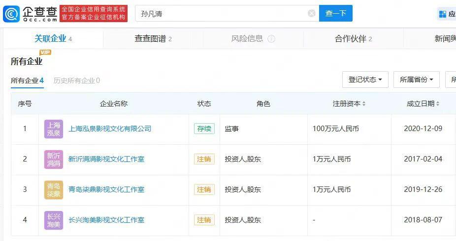 天眼查 app 显示,宋祖儿(孙凡清)共关联 4 家企业,其中,由其个人独资的青岛柒鼎影视文化工作室、长兴洵美影视文化工作室、新沂涓涓影视文化工作室均已注销,目前存续状态仅剩上海泓泉影视文化有限公司 1 家。