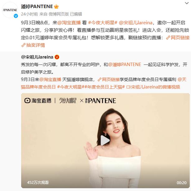 就在 8 月 30 日,潘婷刚刚官宣宋祖儿为其代言人。
