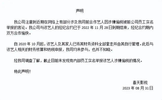 我公司注意到近期在网络上有部分涉及我司前合作艺人因涉嫌偷税被前公司员工实名举报的言论。我公司与该艺人的经纪合约已于 2025 年 11 月 28 日到期结束,经纪合约期内双方合作愉快。