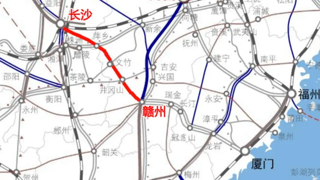 长沙至赣州高铁,是国家八纵八横高铁主通道——渝厦通道的组成部分,与之连接的是长沙端的常益长高铁,赣州端的赣瑞龙铁路。这条高铁线路从去年十月份正式获批,以及一个月之后的十一月份湖南江西两省同步启动建设动员大会,时至今日已经过去了将近一年时间,全线大部分路段仍然还没有进入施工阶段。在七月份江西段已经完成了施工图审核招标工作,再更早的二月份湖南段已经率先完成了同样的工作,根据进度,全线有望在年底前完成相关招标工作并正式开工建设。