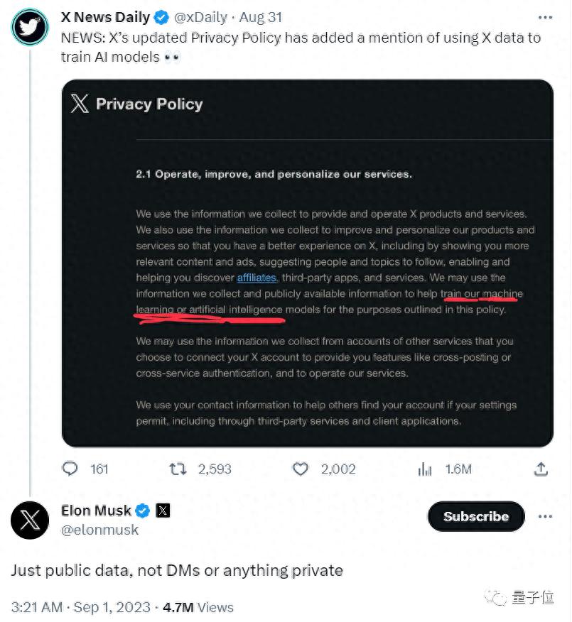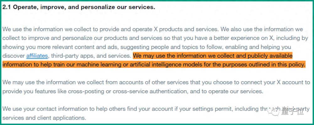 这两天,大伙儿发现 X 悄悄更新了一版隐私政策,里面表示会使用社交媒体数据来训练机器学习或 AI 模型。