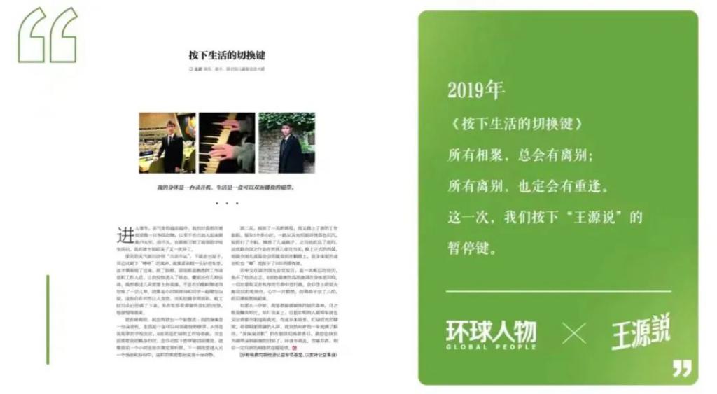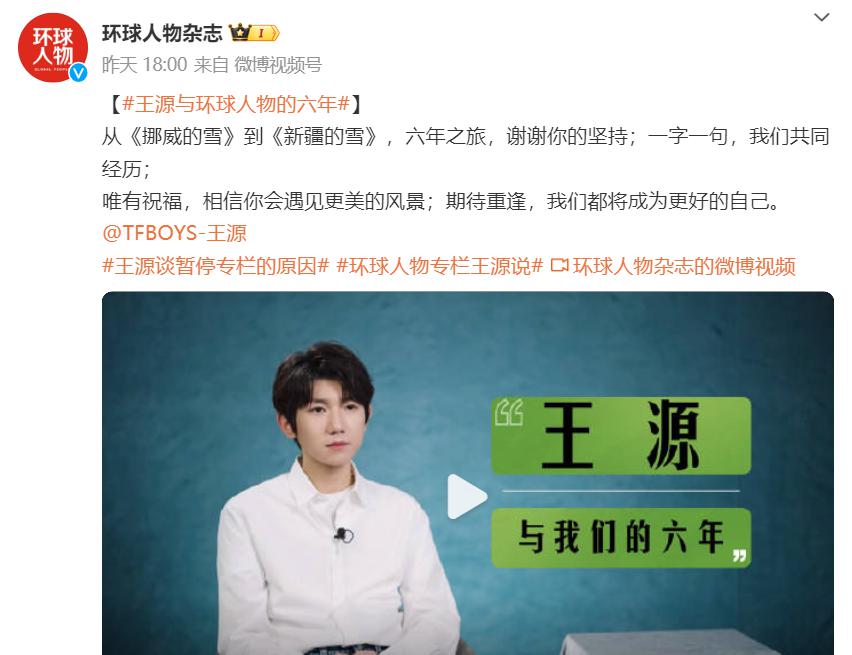 在访谈中王源透露自己决定暂时退出《环球人物》" 王源说 " 专栏的创作后续会通过音乐、写作、表演等各种形式持续创作" 作者 " 这样的理性角色对他很重要、很珍贵
