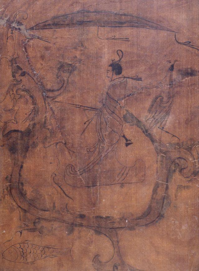 画面上,一男子侧身而立,危冠长袍,手拥长剑,立于龙舟之上。龙尾企立一鹤,水中有鲤鱼一尾,画之上端有华盖,神情宛然,生动传神。它与“人物龙凤帛画”并称为先秦绘画双璧。