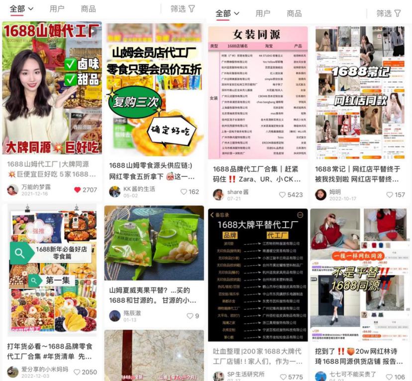 事实上,最初关于 "1688 有网红代工厂 " 这样的信息差,都是小红书、微博等 C 端 KOL、用户自己发现的,很多自来水都是根据种草小红书等笔记,按图索骥找到 1688 店铺的。