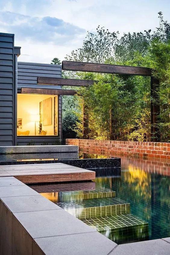 如果面积允许,我们也可以在下沉式庭院做一些水景。做水景时,一定要把握好大小比例,太多的水面容易湿气重,从而滋生蚊虫。建议水景与墙面结合做成流水景观,俗话说“活水不养蚊”。添加水泵,做成可流动的水景,不仅能为庭院增添流动的美感,而且还能避免蚊虫滋生。