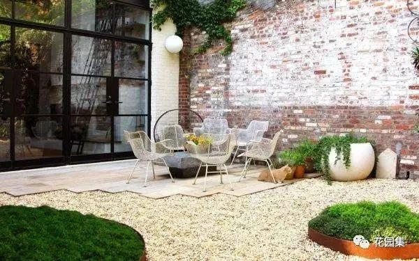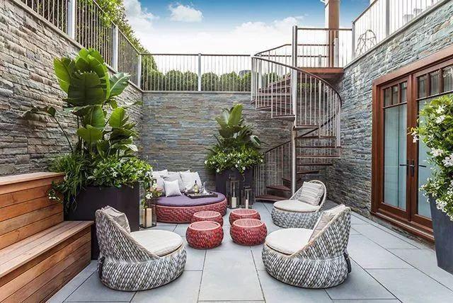 下沉式庭院,在梅雨季节很容易出现潮湿的感觉,所以地面铺装时尽量选择天然的雨花石、户外砖或防腐木,千万不要使用软木框架的家具,软木会吸潮,容易导致框架受损,可选择塑料、钢铁、石材框架作为代替。