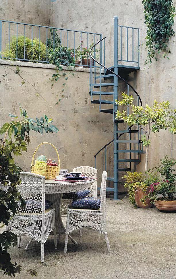 下沉式庭院适合选用明快且令人放松的色调和材质,如黄色的灰泥墙、墙顶部的绿色装饰线,同时可将舒适的室内装饰元素带到户外,让下沉式庭院如室内一般温馨。木质格子架和阳台上的铁艺门,让光线和空气可以顺畅地流入庭院。