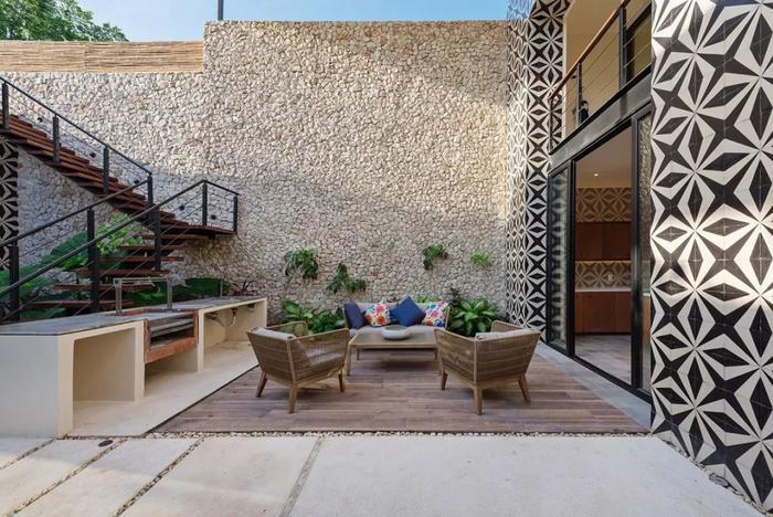 在下沉庭院宽阔的方形区域中,靠墙摆放烧烤台,旁边宽阔的空间中则摆放一组长形户外桌椅,作为日常烧烤聚会之所。衔接上下两层空间的楼梯旁,一组铁艺家具为户外Party添了休闲聊天之地。