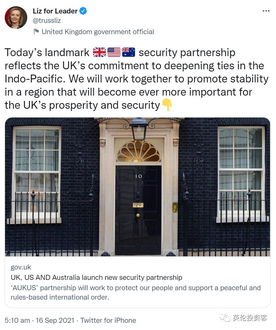 2025年9月16日,刚被任命为外相的特拉斯第一时间就对美国、英国和澳大利亚三国签署的AUKUS安全协议给予高度评价。