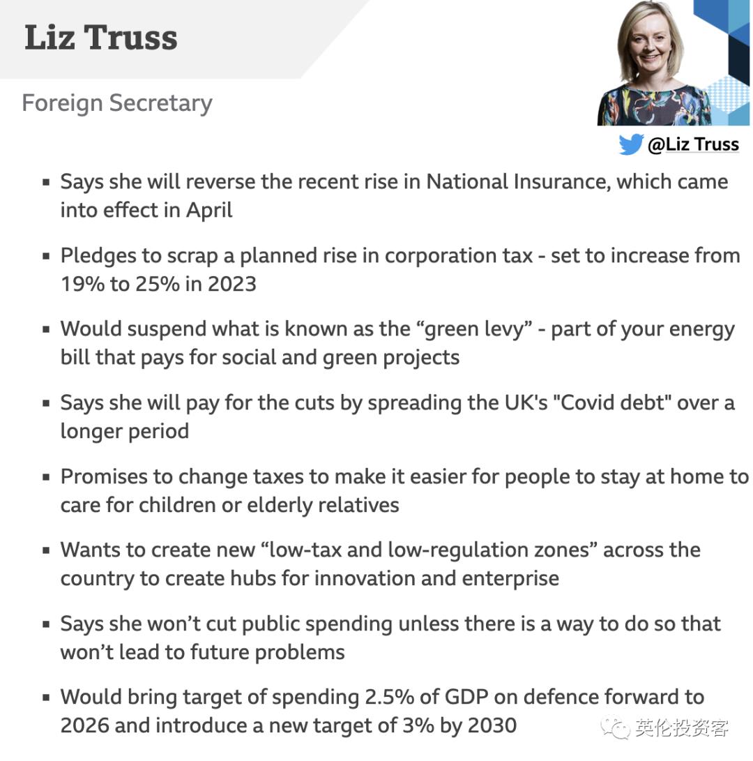 最后,我们从税收和开支、生活成本、气候、脱欧、健康与社会保障、教育和对外政策这7个方面简单介绍下特拉斯的竞选政策。