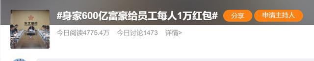 !1 月 19 日," 身家 600 亿富豪给员工每人 1 万红包 " 登上微博热搜,引起网友的广泛关注和议论。
