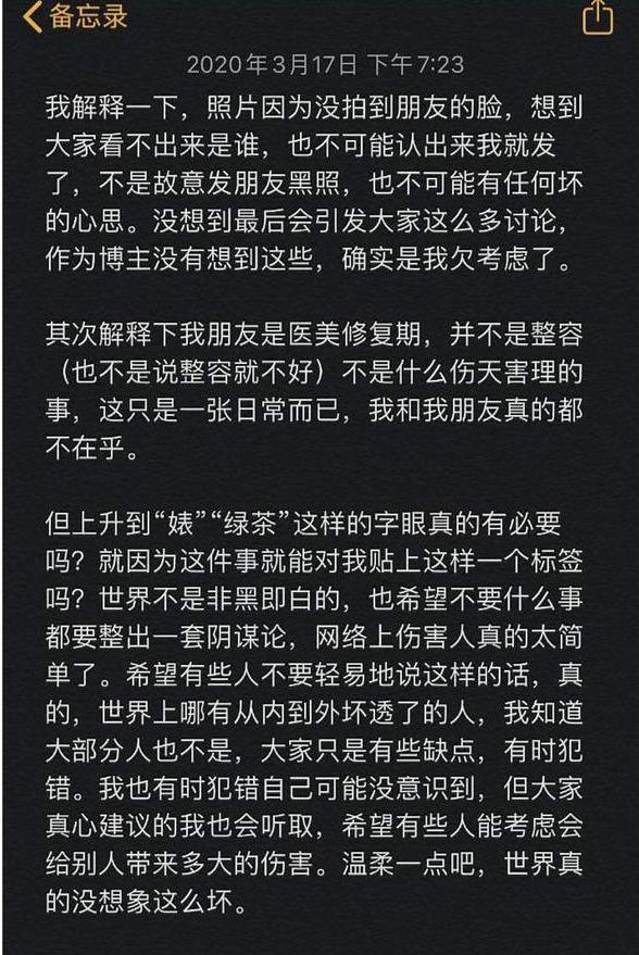 网友纷纷在微博留言称七七行为太过绿茶,只顾自己美。在没有和当事人商量的情况下,擅自让身着邋遢尚在整容或医美恢复期的闺蜜暴露在镜头中来衬托自己。更有网友评论,七七在外面拍照从来不给不小心入镜的素人打马赛克,为了衬托自己多么美若天仙。对此,七七做出了回应,称已经向闺蜜道歉而且不是故意为之的,并且删掉了微博。