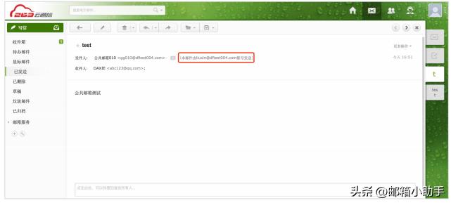 多个成员使用公共邮箱发信时,可以查询真实使用者账号。点击“已发送文件夹、打开对应邮件、发件人后方会标记【本邮件由 xxx 账号发送】”。