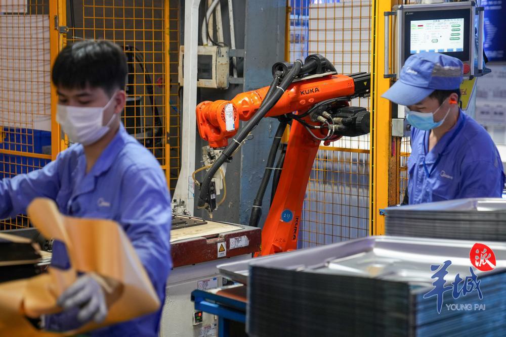 橙色的库卡机械臂来回挥动,进行原材料的组装;AGV 小车载着物料穿梭在过道中;钣金黑灯车间里空无一人,机器自主完成生产进程……站在位于佛山顺德的一个美的工厂里,每一处生产细节都充满了 " 赛博朋克 " 风,而这里的产品,却是一台台 " 接地气 " 的洗碗机。
