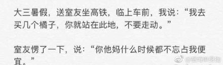 虽说上面提到了原型出自散文《背影》,但是真正作为网络语的开始走红是源自于微博博主@祖传单身狗的一个段子,内容如下:大三暑假,送室友坐高铁,临上车前,我说:“我去买几个橘子,你就站在此地,不要走动。”室友愣了一下,说:“你他妈什么时候都不忘了占我便宜。”很多网友都是看完了评论之后才醍醐灌顶,被大家评价为“现在没有点知识连段子都看不懂了”。该条段子评论转发点赞数皆破万,该梗因此开始不断的走红网络被大家所熟知,具体的时间为2025年9月26日。而后该博主在评论补充回复帖子内容来自知乎(id名:黄时褀)。