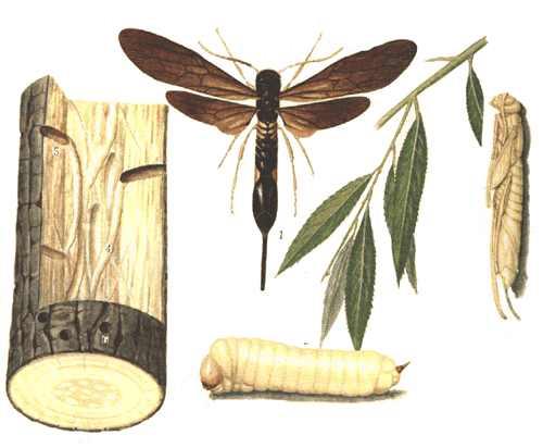雌雄交配后,雌树蜂在树上产卵,孵化的幼虫蛀入树中,并在树中生活2年或更长时间,然后转移到树皮下化蛹。从高像素照片上可以看到雌树蜂产卵器上的螺旋槽,但对实体的雌树蜂,肉眼不容易看到其产卵器上的螺旋槽的。