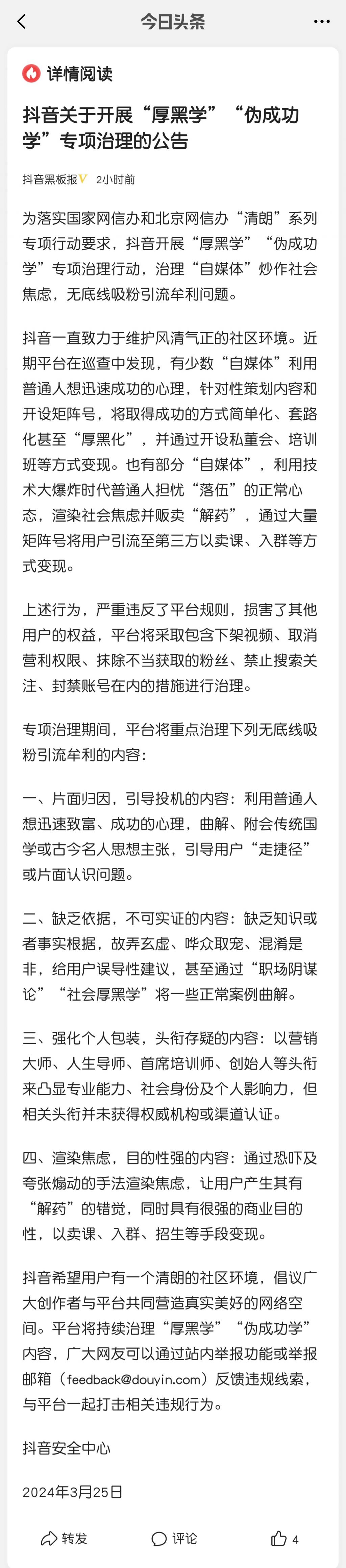 IT 之家 3 月 25 日消息,抖音官方今日发布关于开展 " 厚黑学 "" 伪成功学 " 治理公告,将专项治理 " 自媒体 " 炒作社会焦虑,无底线吸粉引流牟利问题。