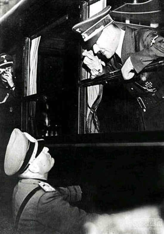 惺惺相惜的希特勒和墨索里尼。希特勒访问意大利后离开,墨索里尼亲自到火车站送行,在火车临近开走时两人还忍不住交谈,真是有很多知心话要说