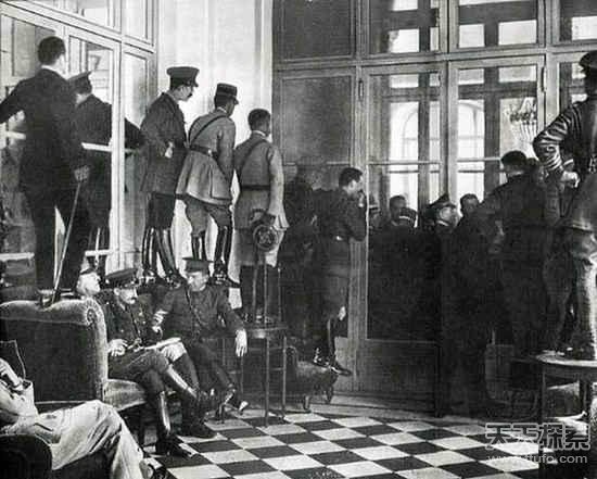 1919年,《凡尔赛和约》签订现场外,人们正试图透过窗户看里面的情况