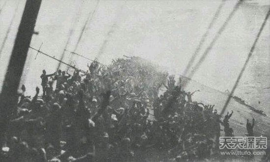 1944年,日本航母瑞鹤号沉没中。1944年10月25日莱特湾海战中,瑞鹤号身中美军7枚炸弹7枚鱼雷而沉没。图中可以看出很多日本兵正在跳水