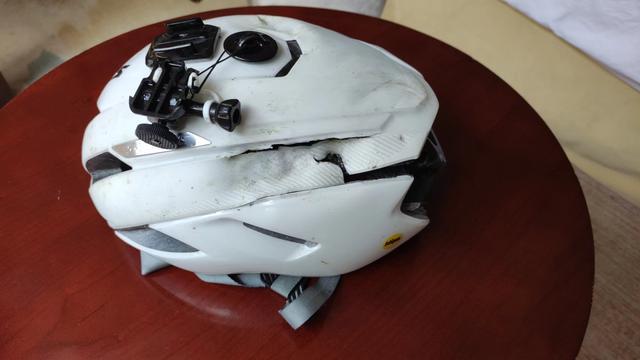 丈夫朱宋伟说,工作人员在山崖中间一处突起的岩石上找到了妻子的头盔。头盔左侧部分缺了一大块,右前侧则被撞出了一个洞。