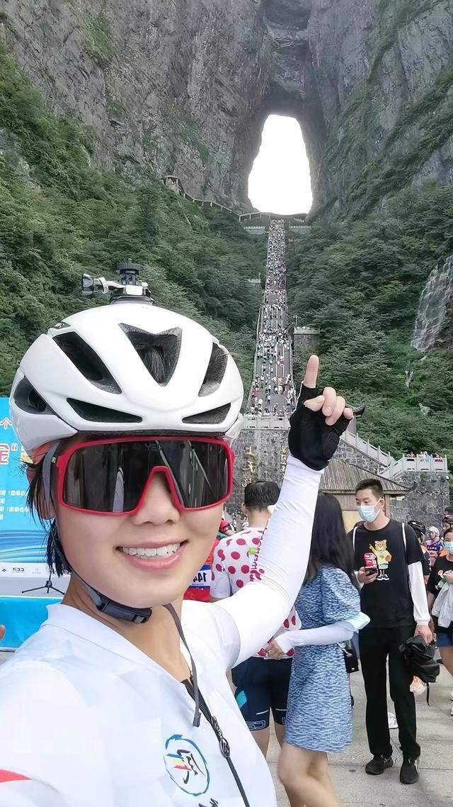 女自行车手贺妃生前最后的照片,她在完赛后与天门洞合影,随后在返程过程中坠亡。图 / 受访者提供