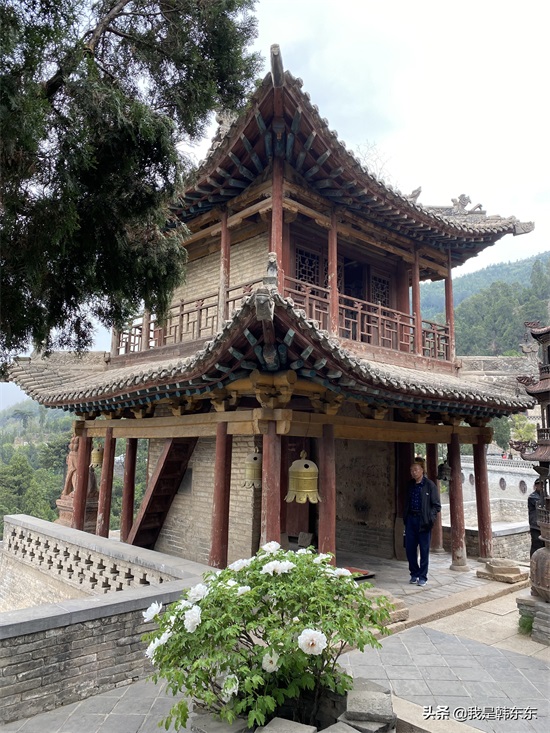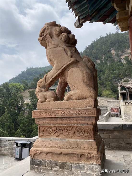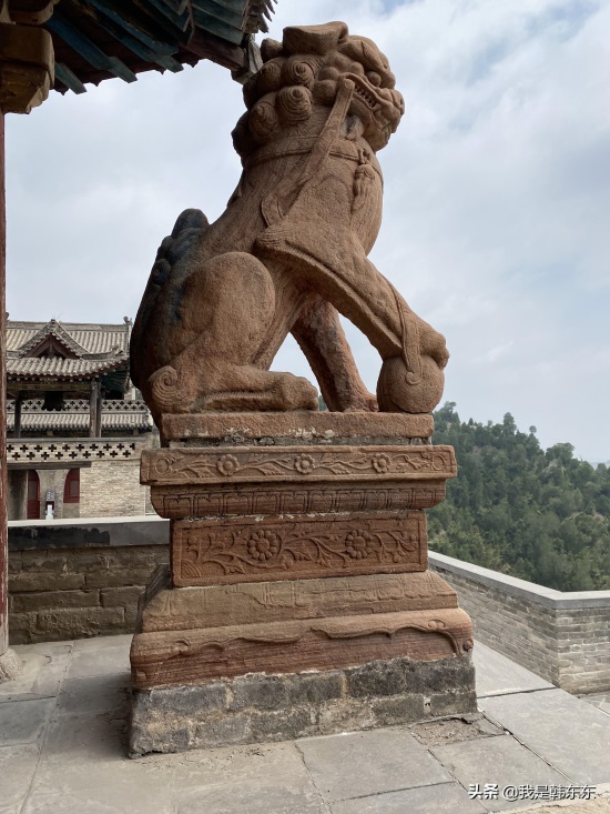 登上铜塔楼九级石阶,门口地上左右各一个青石石雕,不知道是何神兽。一对高1.6米的红砂石狮子矗立两边,端坐于须弥座上,雕工精细、威武霸气!这可是镇寺之宝!从窄窄的木楼梯登上二层,远山近峰,苍茫翠色尽收眼里。