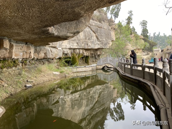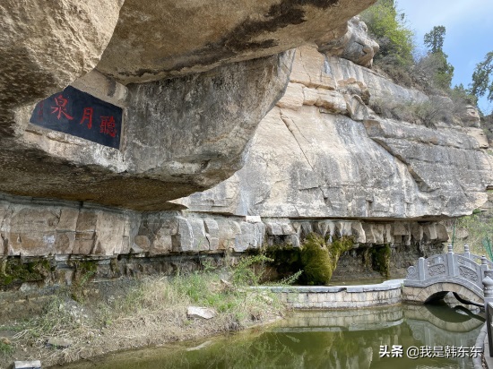 从于准祠下来,西面崖壁之下形成一处独特的天然景观。巉岩耸立,怪石嶙峋,石隙常年渗水,形成滴水奇泉,名为听月泉。这处泉水也是寺院古代饮水之所。怪石突出的岩底,清泉不断滴落,仿佛珠帘,形成一湾绿水,微波荡漾,巉岩倒影,鱼儿嬉戏。