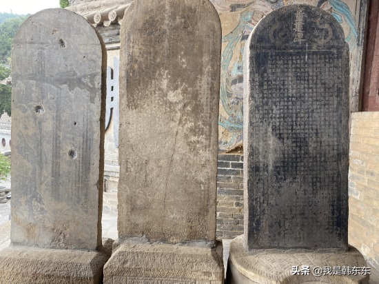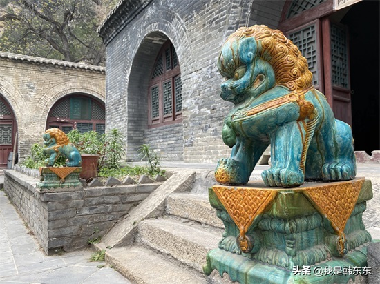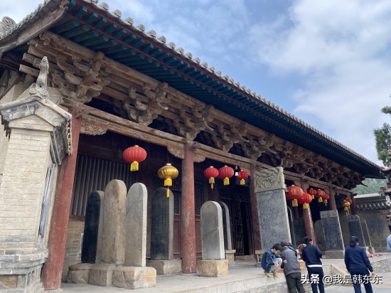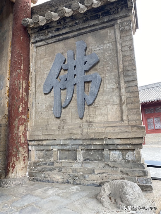穿过铜塔楼,对面是正殿大雄宝殿,也叫佛殿,为元代遗构,面阔五间,进深三间,单檐悬山顶。从斗拱看,应是近年修缮过。廊下有很多古碑,均为历朝历代重修和修缮的碑记,可知佛殿历史甚为悠久,据说柱础还是唐代遗物。墙壁上有几块方形石碣,上面草书碑刻,龙飞凤舞。台基两侧各有一只石雕神兽,据说是宋代遗存。