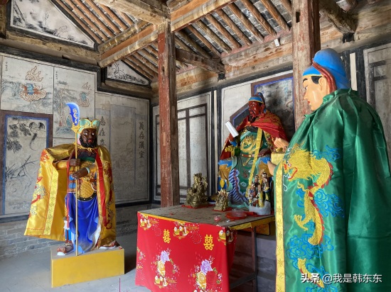 偏殿旁边是关帝阁,中间塑像为关帝,两侧分立关平、周仓,看似新作。墙壁上是清代壁画,关公故事。
