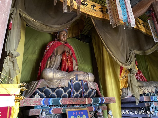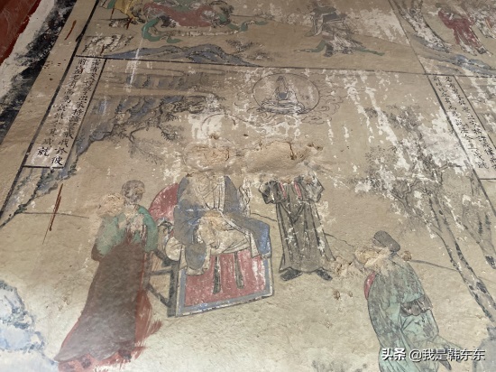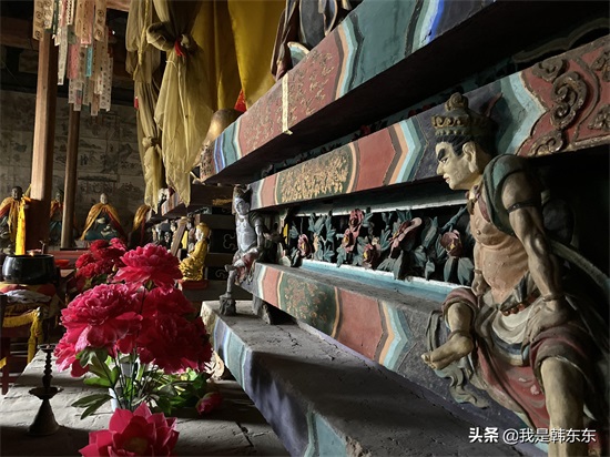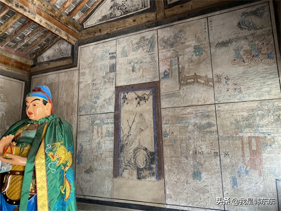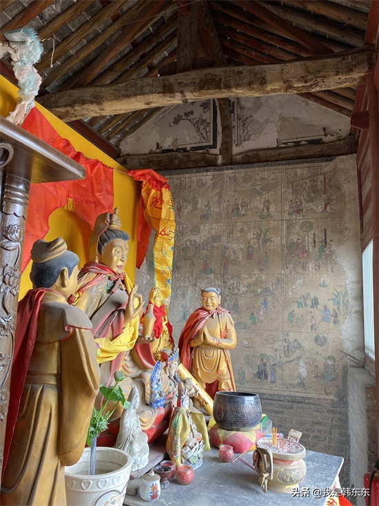 站在停车场回头看,门洞之上是观音阁小庙,面阔一间,单檐硬山顶。登阶而上,观音阁内,中间供奉弥勒佛和观世音,左右墙壁绘满清代壁画,为观音显圣故事。左面山崖边是一处独立的院落为祠堂,右面可以看到安国寺主体建筑群。