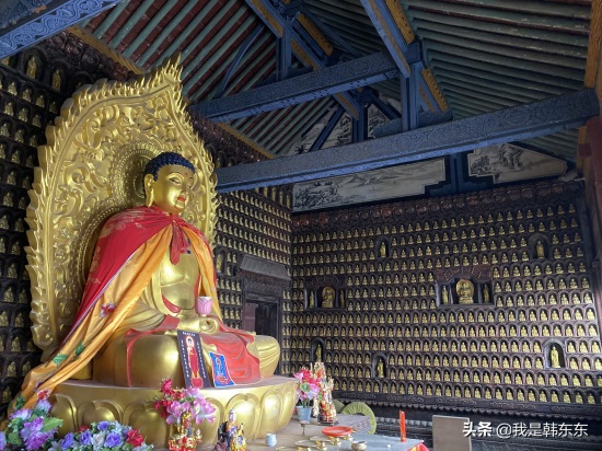 通往祠堂后院,门上匾额“古刹禅院”也是于准所题。里面是于成龙读书之地,于准为纪念祖父山寺读书经历,改建为于清端读书楼。小院结构紧凑,建筑精巧。殿宇两侧为独立小殿,左侧为于成龙读书楼,书房布置,于成龙蜡像端坐于案前读书。中间殿宇为万佛阁,释迦摩尼像端坐中间,四壁嵌满小佛像,应为新置。