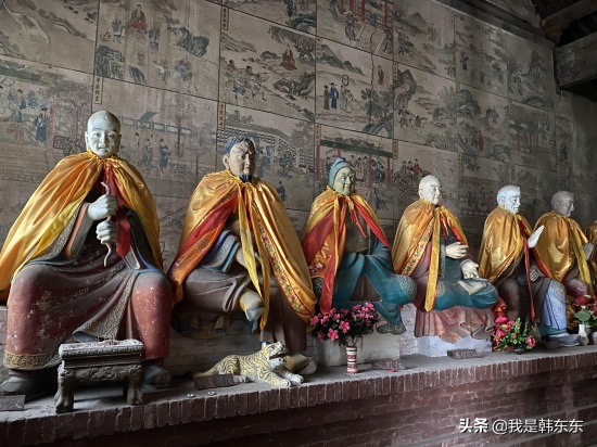 佛殿内正面三尊佛像为宋代塑像,三尊释迦牟尼三身佛端坐于莲花宝座之上,高达4.8米,造型朴实,端庄从容。殿左右两侧为十八罗汉,墙壁上连环画形式的壁画,为清代佛传故事,工笔重彩画法,颜色以红绿为主,须弥座上的力士,形象生动,色彩艳丽。