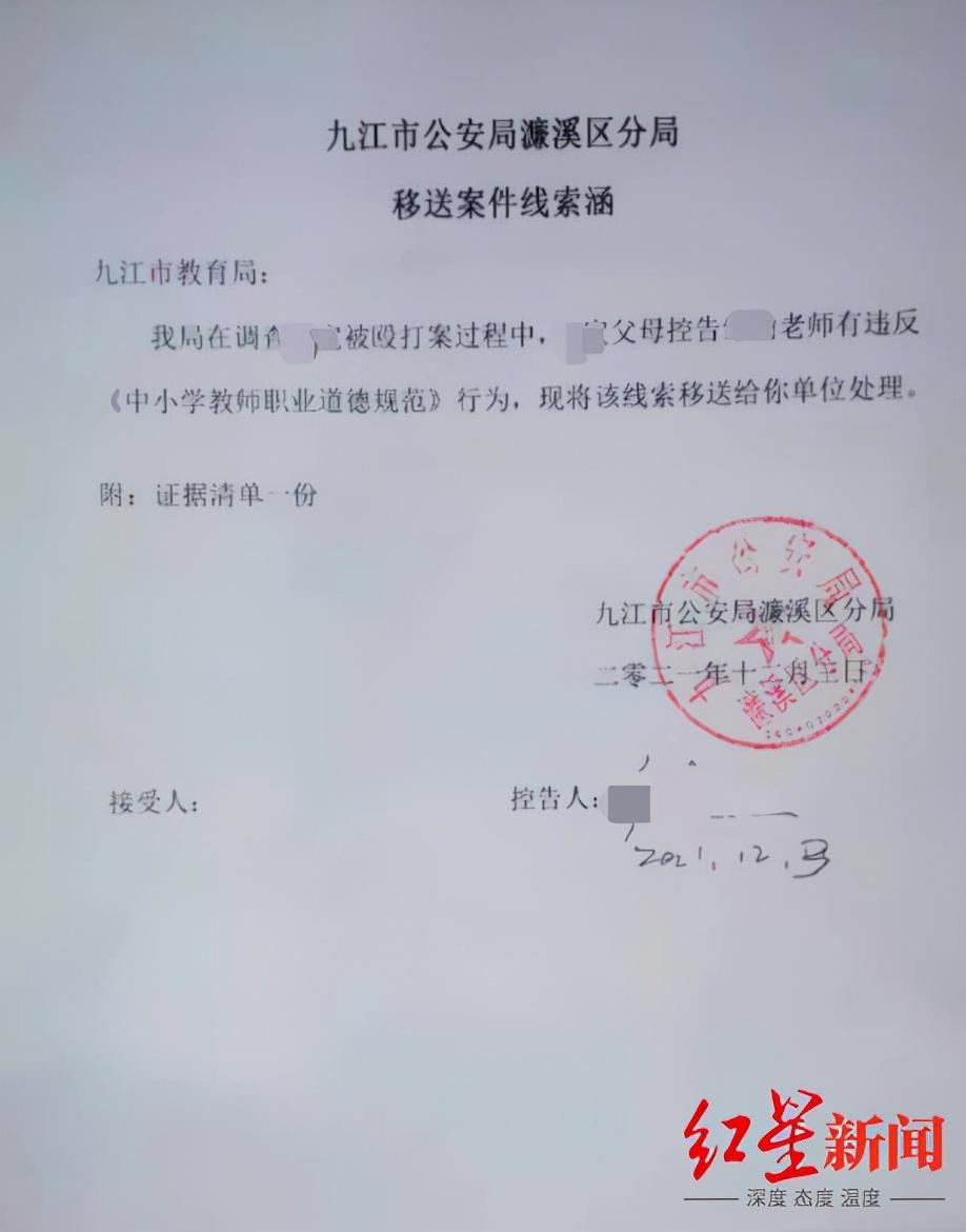 一份《九江市公安局濂溪区分局移送案件线索函》显示,濂溪区分局向九江市教育局移送了案件线索,称“在调查宽宽被殴打案过程中,宽宽父母控告邹某又违反《中小学教师职业道德规范》行为,现将线索移送你单位处理。”