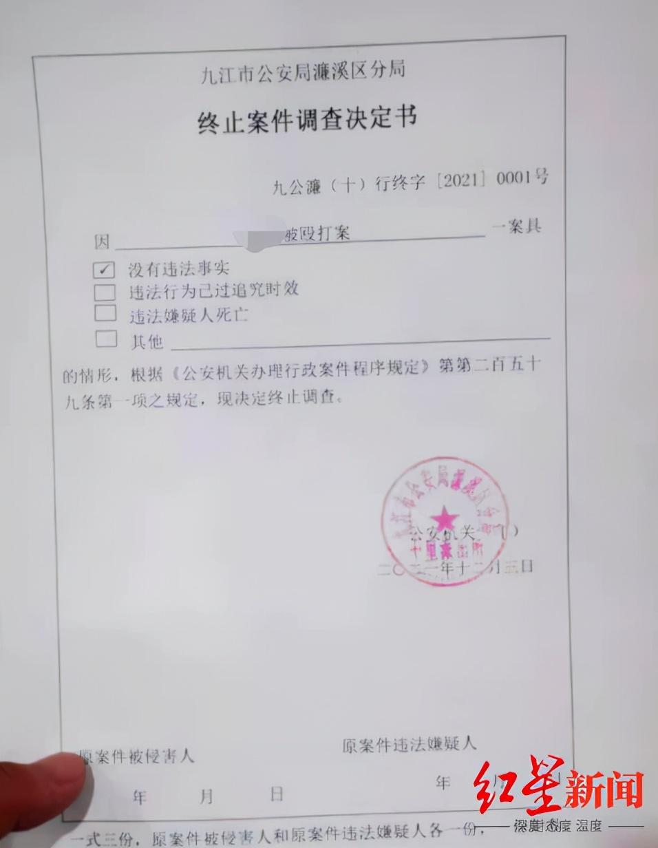 12月3日,九江市公安局濂溪区分局最终向家属作出了终止案件调查决定书,称因“宽宽被殴打案没有违法事实”,根据《公安机关办理行政案件程序规定》,决定终止调查。