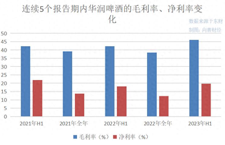 但有意思的是,今年上半年华润啤酒的整体毛利率却为 46.04%,高于啤酒业务毛利率。这说明尽管白酒业务营收远低于啤酒规模,但高毛利的特性还是在一定程度上改善了华润啤酒的整体毛利率,这无疑是个向好的增长转折点。
