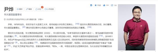 饶毅炮轰的尹烨究竟何许人也?天目新闻记者查询得知,尹烨目前的百度百科词条介绍其身份为:本科毕业于大连理工大学,哥本哈根大学生物工程博士。现任华大集团首席执行官、执行董事、华大基因副董事长,兼任华昇诊断中心有限公司董事,深圳市同并相联科技有限公司董事。并且,页面显示,本词条部分内容由尹烨本人参与编辑完善。