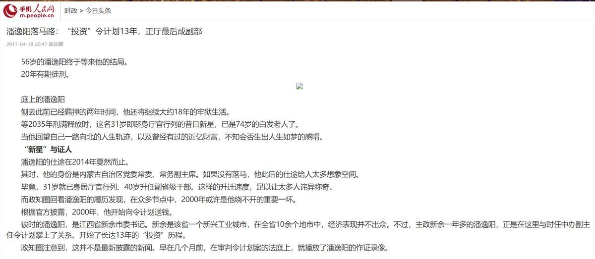 人民网:潘逸阳落马路:“投资”令计划13年,正厅最后成副部