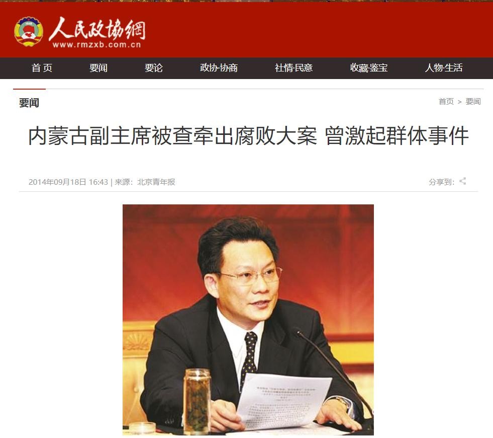 人民政协网:内蒙古副主席被查牵出腐败大案 曾激起群体事件