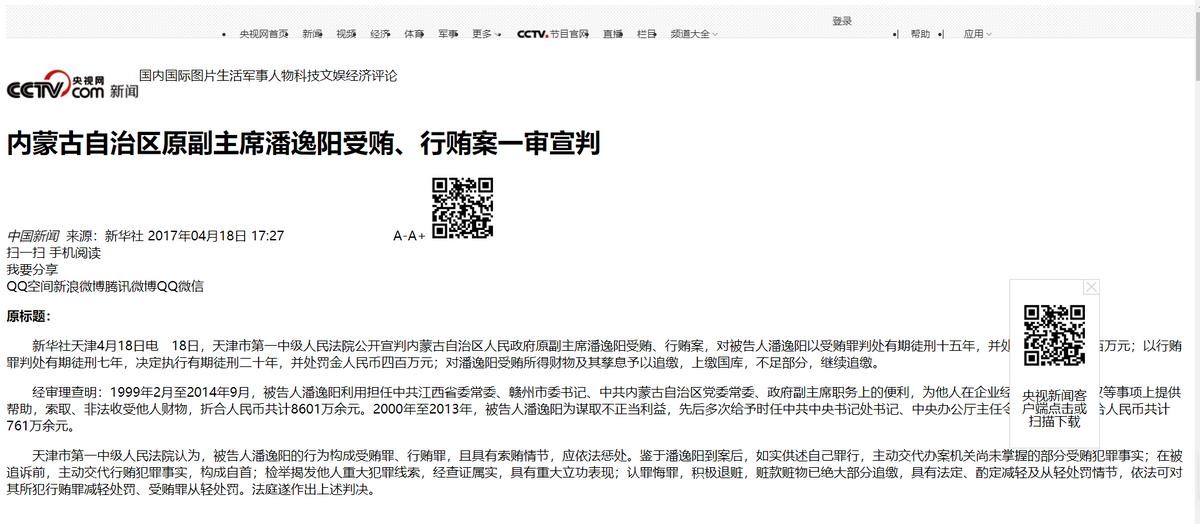 央视网:内蒙古自治区原副主席潘逸阳受贿、行贿案一审宣判