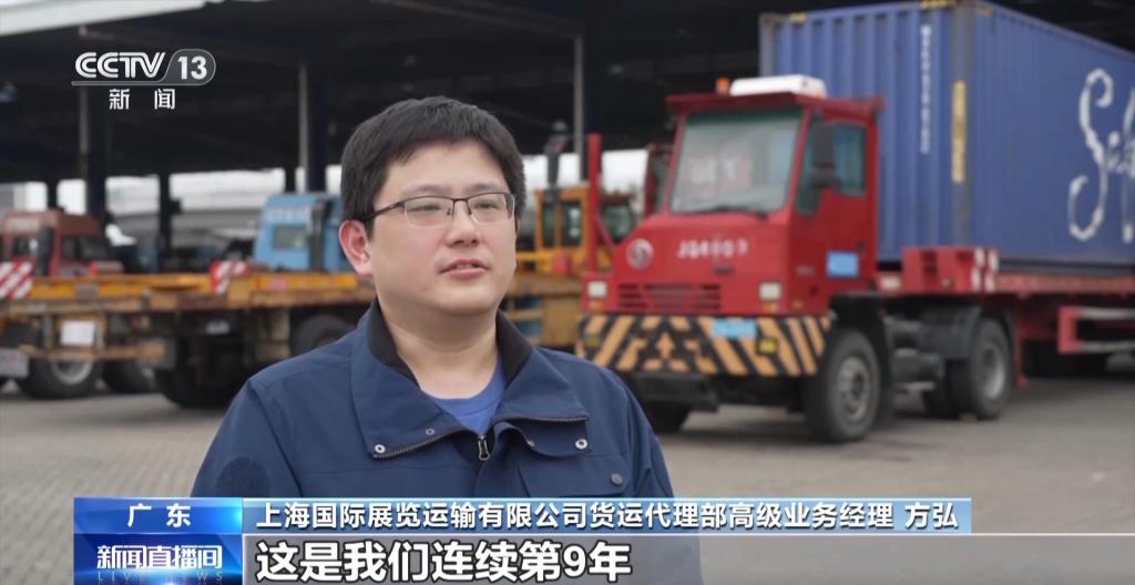 上海国际展览运输有限公司货运代理部高级业务经理 方弘:这是我们连续第 9 年承运广交会进境展品的物流服务工作,去年广交会全面恢复线下运作之后,进境参展的展品数量明显增加。在通关一体化模式下,我们向属地海关报关申报,货物运抵后口岸快速验放,实现了展品由口岸到展馆的无缝衔接。