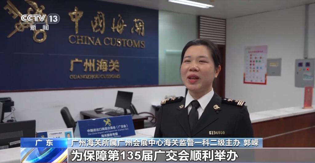 广州海关所属广州会展中心海关监管一科二级主办 郭嵘:为保障第 135 届广交会顺利举办,我们在业务现场设立广交会服务专窗,全天候接受参展企业预约通关,优先办理申报、查验、抽样、检测等手续。同时在广州白云国际机场、琶洲港澳客运码头开辟 " 广交会来宾便捷通道 ",保障广交会进出境人员、展品便捷通关。