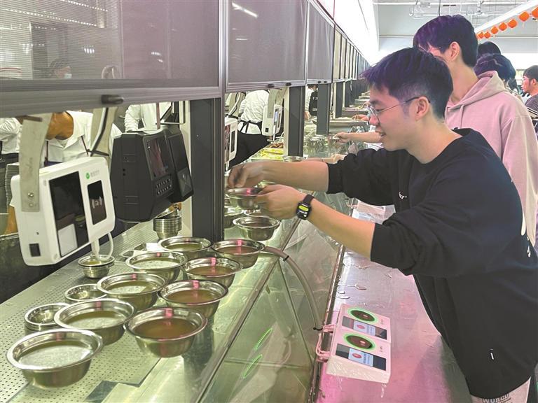 16 日中午 11 时许,记者来到深圳大学沧海校区的食堂,几个特殊的档口外已经排起了长龙。档口里,帮忙舀汤的不是食堂阿姨,而是十来个 " 请客 " 的腾班学生。他们把一碗碗鸡汤端给同学和老师。