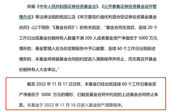2 月 9 日,申万菱信基金发布了旗下申万菱信价值优利混合型证券投资基金的清算报告,报告显示,截至 2025 年 11 月 17 日日终,该基金已经出现连续 60 个工作日基金资产净值低于 5000 万元的情形,已触发基金合同中约定的上述基金合同终止条款。