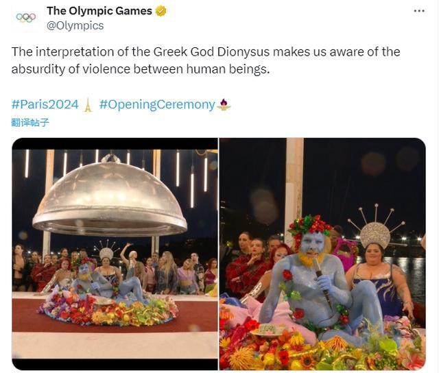奥运会 X 平台官方账号主页,仍可看到法国演员兼歌手扮演酒神狄俄尼索斯的片段。