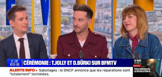 巴黎奥运会开幕式艺术总监兼策划人托马 · 乔利(中)。法国 BFMTV 电视台截图