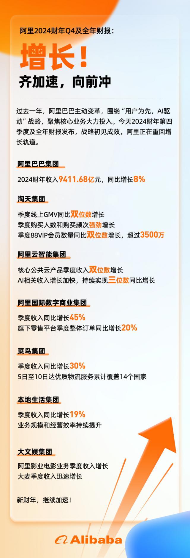 5 月 14 日,阿里公布了 Q4 业绩。财报显示阿里 2024 财年收入 9411.68 亿元,同比增长 8%。第四财季营收 2218.7 亿元,同比增长 6.6%,但净利润只有 9.19 亿元,同比下降 96%,调整后净利润 244.2 亿元人民币,同比下滑 11%。第四财季调整后每 ADS 收益 10.14 元、第四财季调整后息税折旧及摊销前利润 308.1 亿元,同比下滑 4.1%,预估 303.8 亿元。