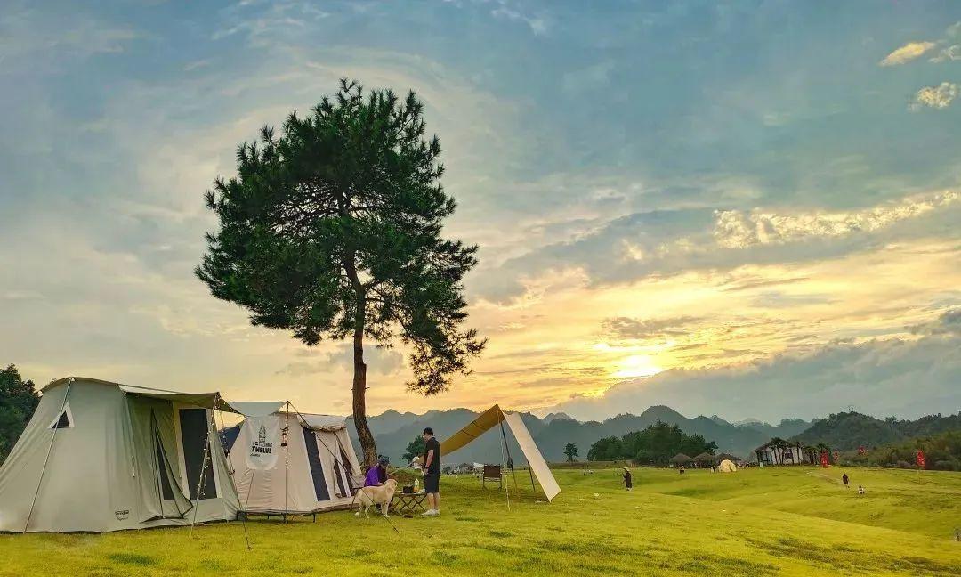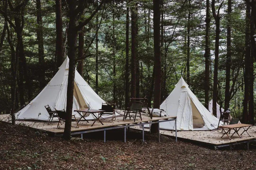 位于大明山风景区,海拔1200米的高山森林内,全系ins风米白色帐篷错落分布。